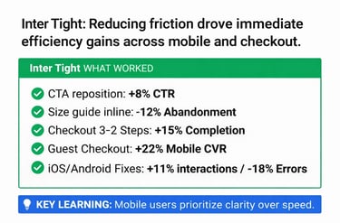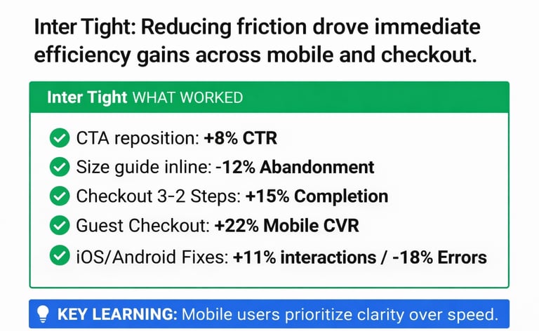 The sprint prioritized friction removal across product pages, checkout, and mobile experience. Several changes produced immediate efficiency gains, including CTA repositioning, checkout step reduction, and guest checkout enablement.